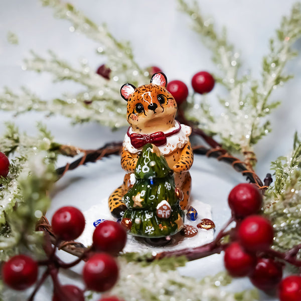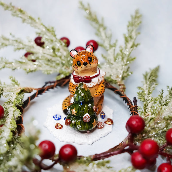 Cheetah with a Christmas tree - Christmas figurine. Animal totem is a unique handmade polymer clay sculpture. This miniature is exceptionally carefully hand painted with maximum detail and finished with glossy protective varnish. You can put it on your desk or give it to your friend as a birthday present ♥