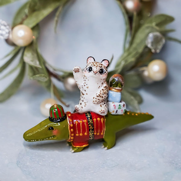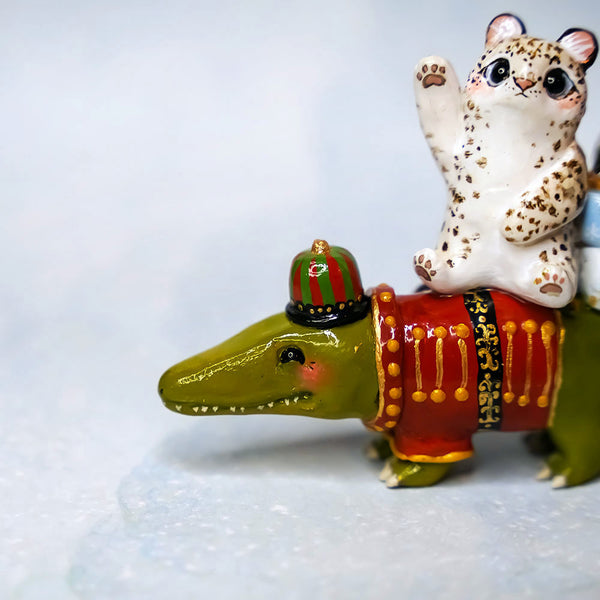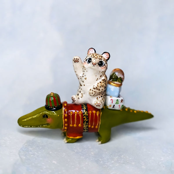 Snow Leopard with Crocodile - Christmas figurine. Animal totem is a unique handmade polymer clay sculpture. This miniature is exceptionally carefully hand painted with maximum detail and finished with glossy protective varnish. You can put it on your desk or give it to your friend as a birthday present ♥