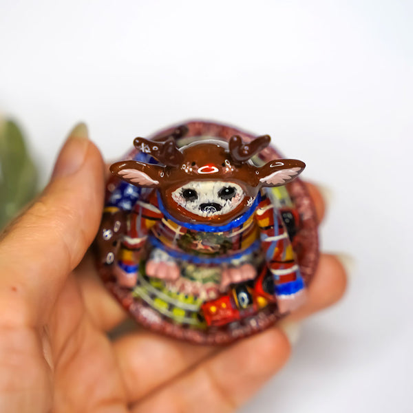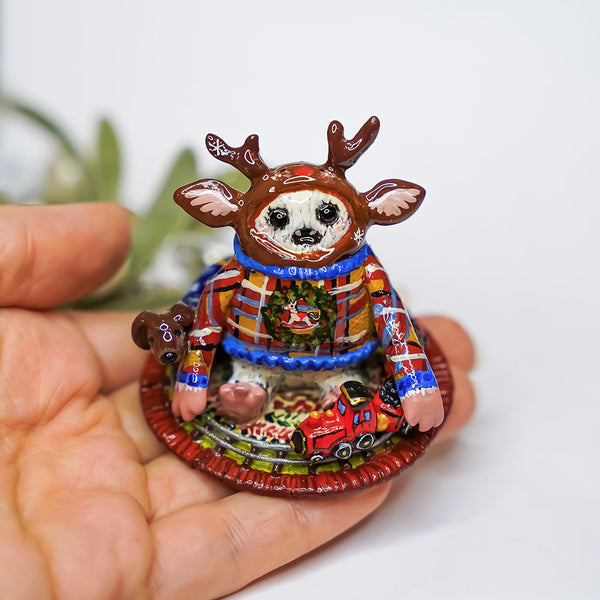 Yeti with Amadeus the Dachshund - Christmas figurine. Animal totem is a unique handmade polymer clay sculpture. This miniature is exceptionally carefully hand painted with maximum detail and finished with glossy protective varnish. You can put it on your desk or give it to your friend as a birthday present ♥