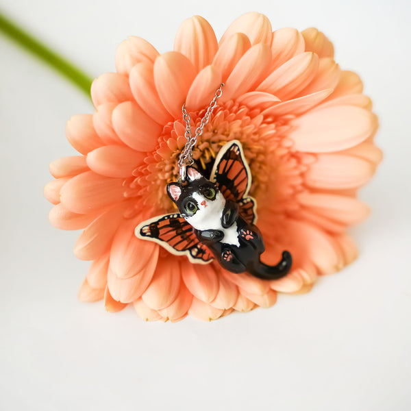 Black and white cat with butterfly wings pendant is a unique handmade polymer clay pendant. This miniature is exceptionally carefully hand painted with maximum detail and finished with glossy protective varnish. You can always have it with you or give it to someone you love ♥