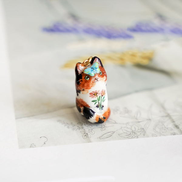 Calico Cat in the meadow is a unique handmade polymer clay pendant.