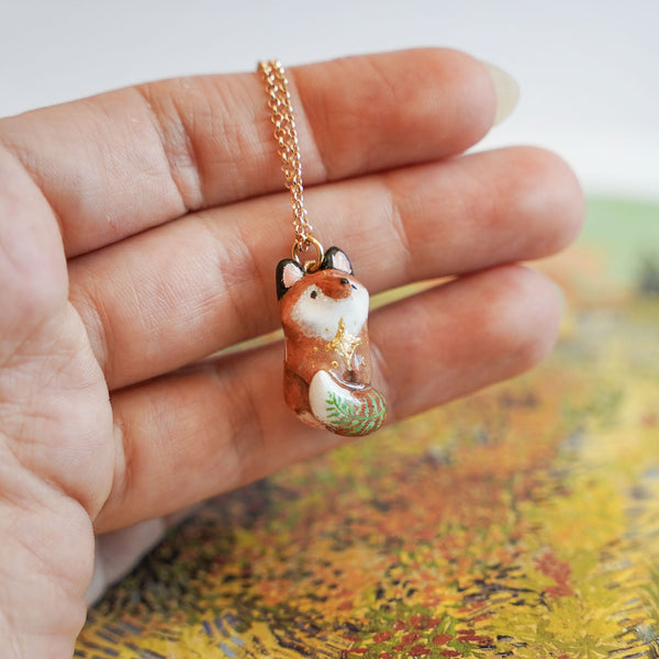 Fox with a star and a fern is a unique handmade polymer clay pendant.