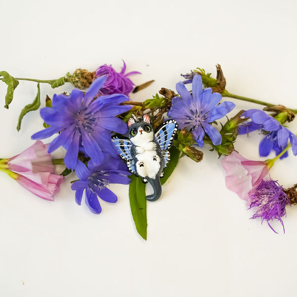 Grey cat with butterfly wings pendant is a unique handmade polymer clay pendant. This miniature is exceptionally carefully hand painted with maximum detail and finished with glossy protective varnish. You can always have it with you or give it to someone you love