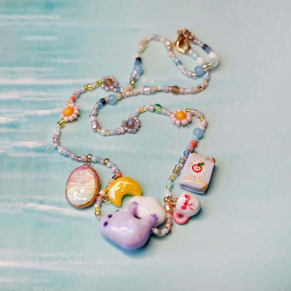 Beautiful glassy beads necklace with charms: Sloth, a fairytale book, the Moon, a starry pendant and a cup of hot tea.