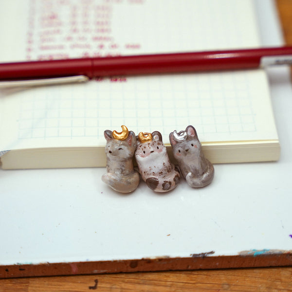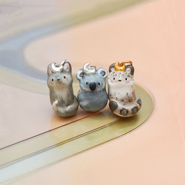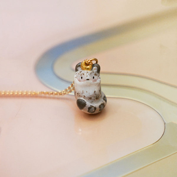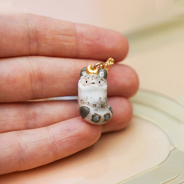 Snow Leopard with the gold Moon is a unique handmade polymer clay pendant.