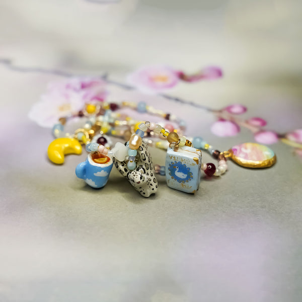 Beautiful glassy beads necklace with charms: Snow leopard with wings, a fairytale book, the Moon, a starry pendant and a cup of hot tea.