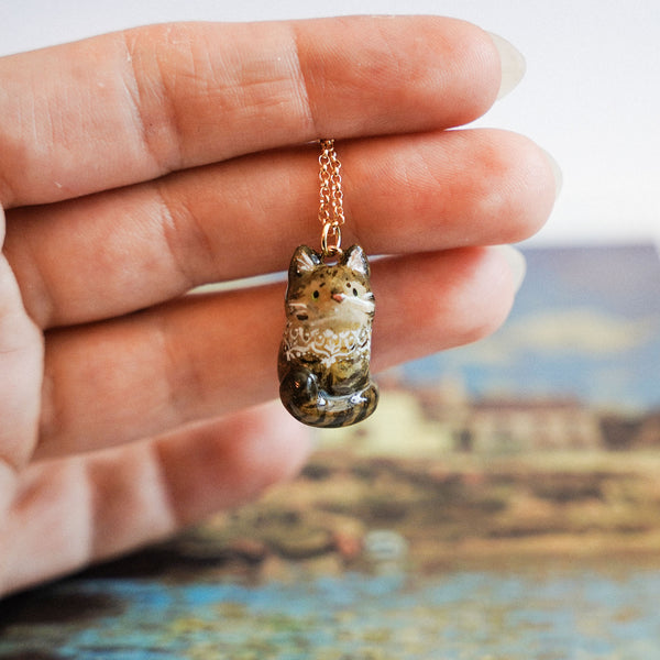 Tabby cat with a lace is a unique handmade polymer clay pendant.