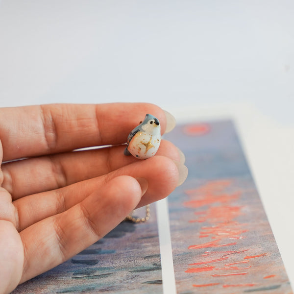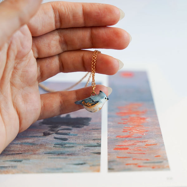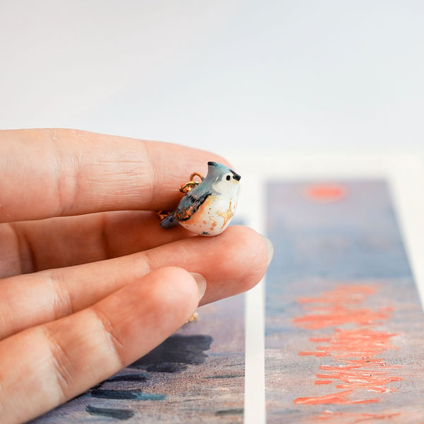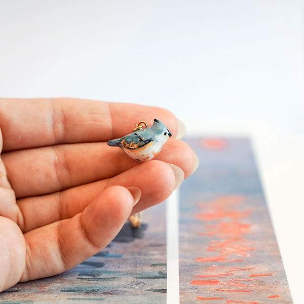 Tufted titmouse with a star is a unique handmade polymer clay pendant.