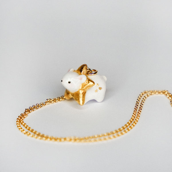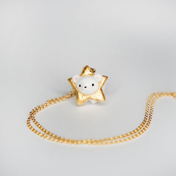 Withe bear with a star is a unique handmade polymer clay pendant.
